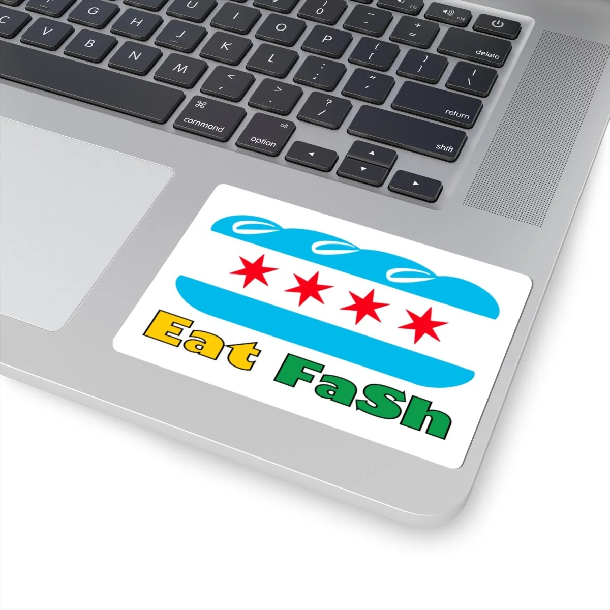 Custom illustration of the Chicago city flag, reimagined as a subway or "hero" sandwich. Four red stars are sandwiched between two blue buns. Below, the text says "Eat Fash."