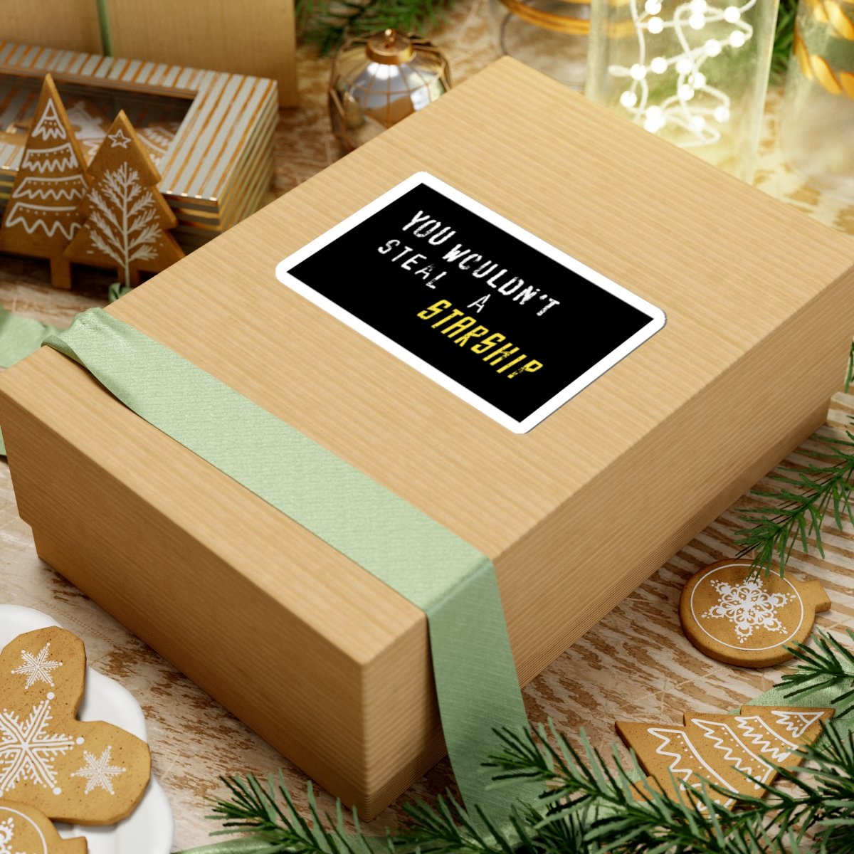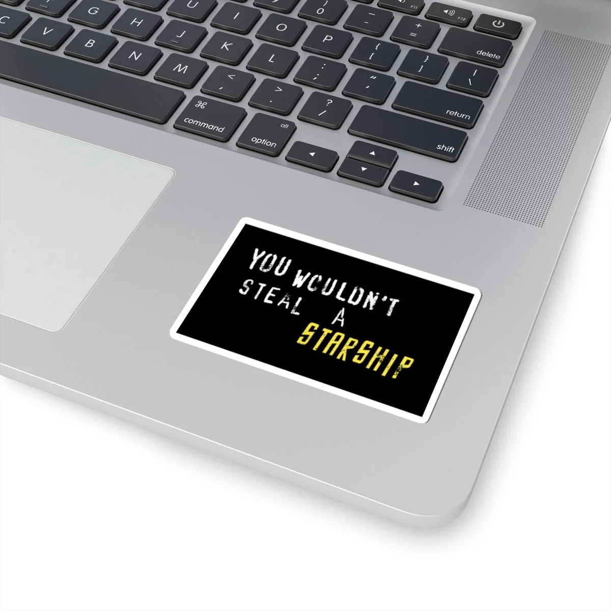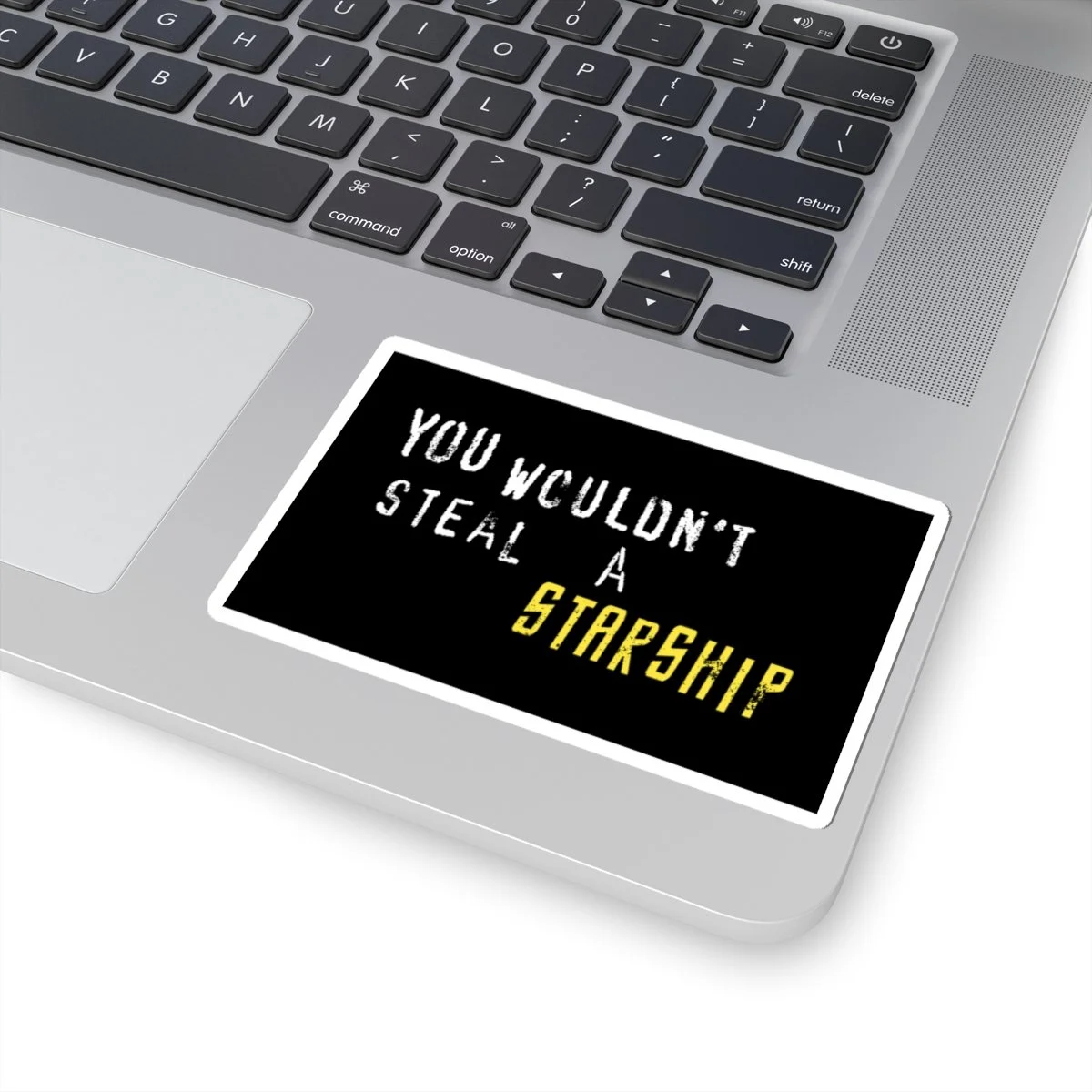 Black sticket with white and yellow text that reads "You Wouldn't Steal A Starship