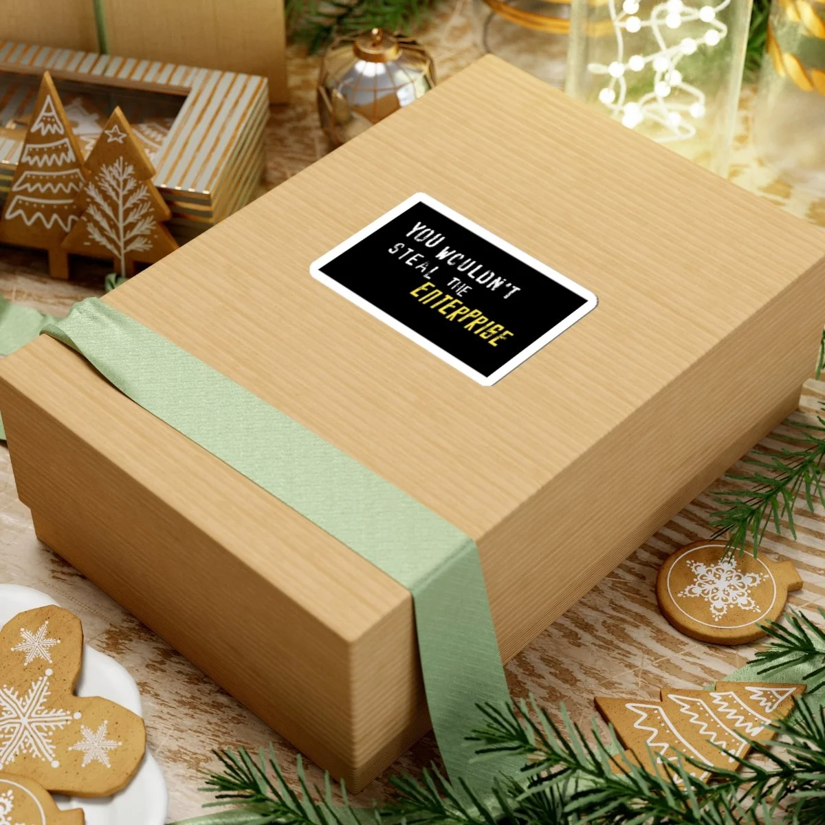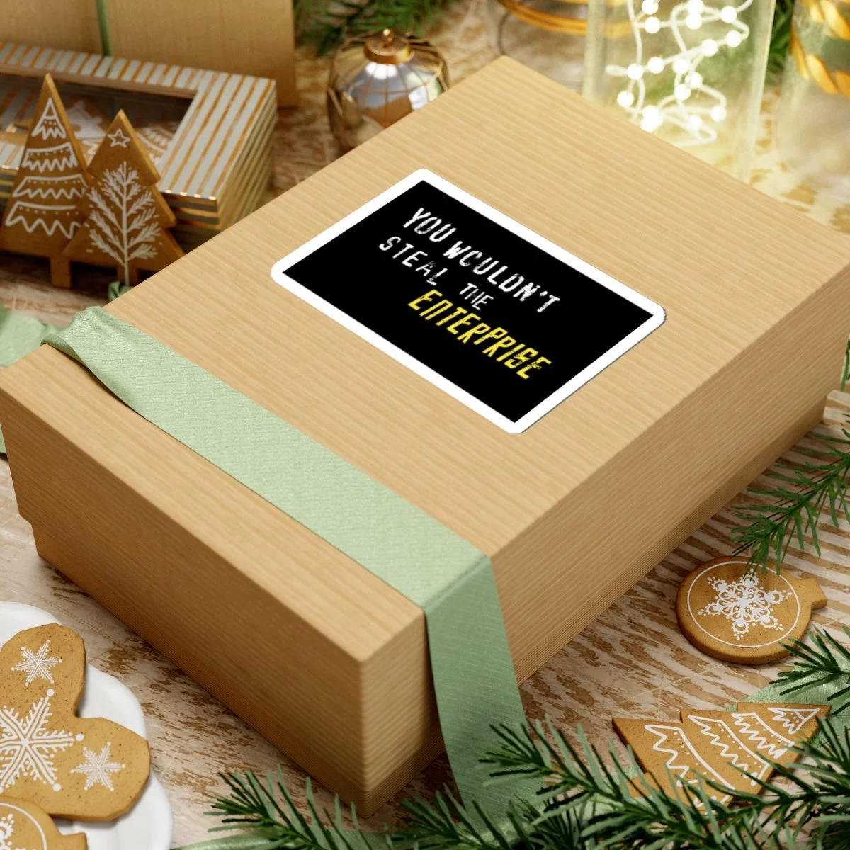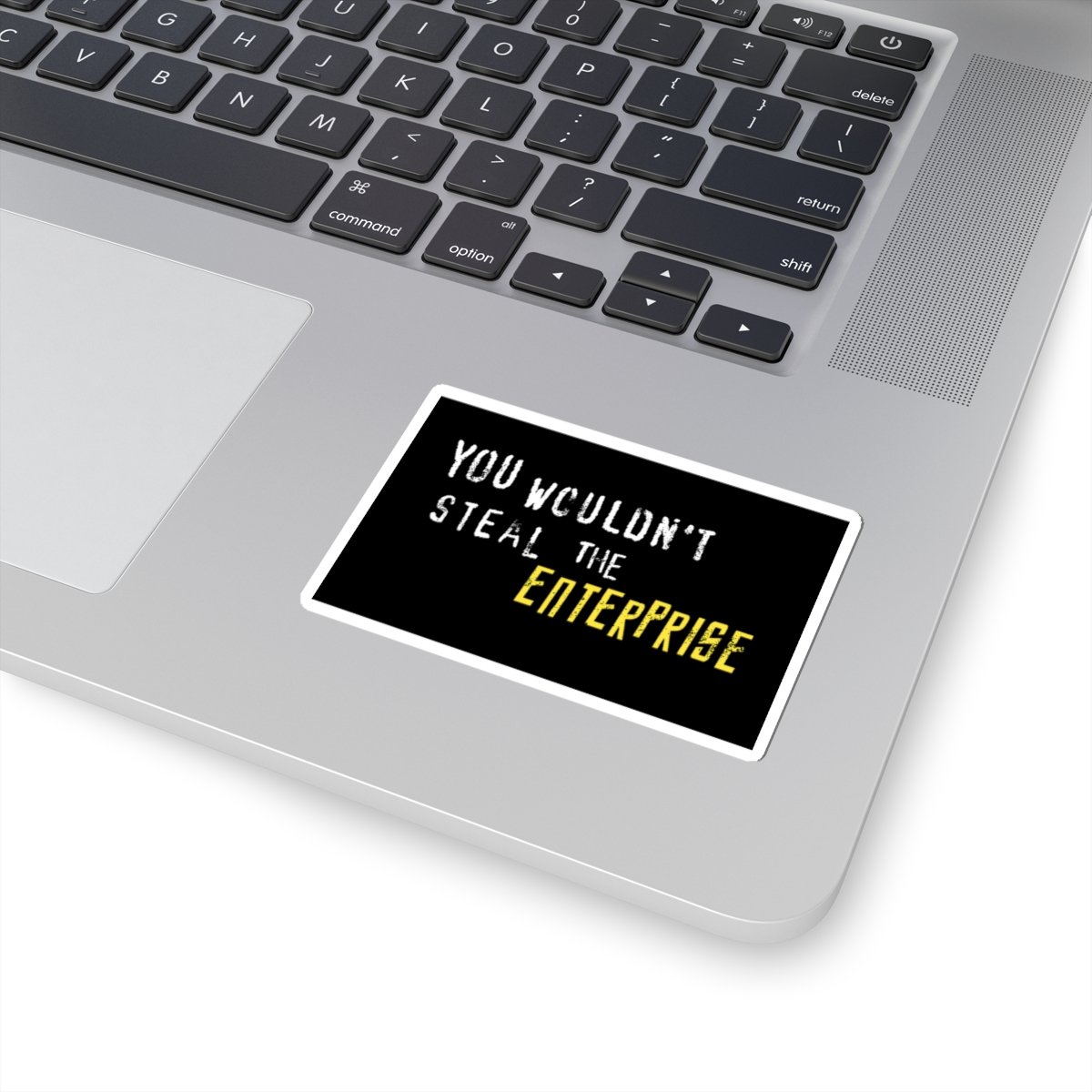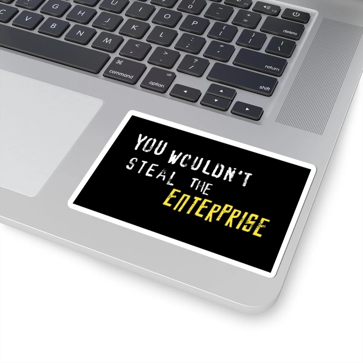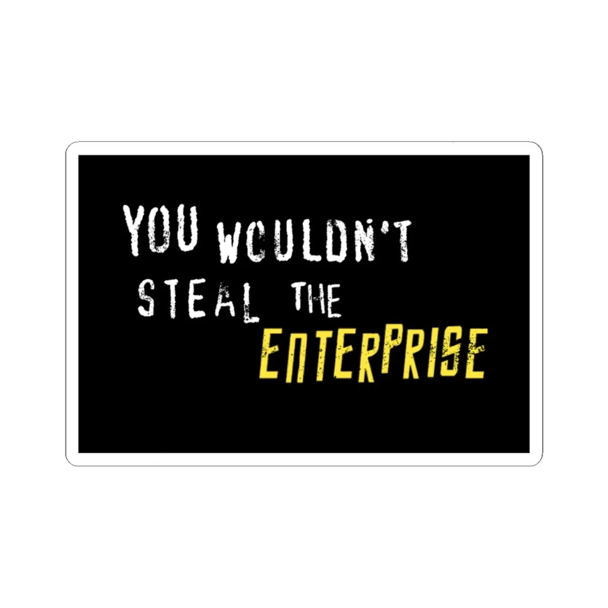 Black sticket with white and yellow text that reads "You Wouldn't Steal The Enterprise."